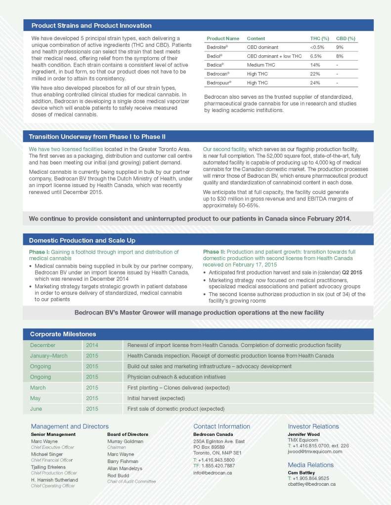 A March 2015 flyer for Bedrocan, an early licensed producer of medical cannabis in Canada. Having started with importing medical cannabis through the Dutch Ministry of Health under a complex import license issued by Health Canada, this document highlights the optimistic early beginnings of domestic cannabis production in Canada. Submission by Mary DuRocher CEO of Fox D Consulting