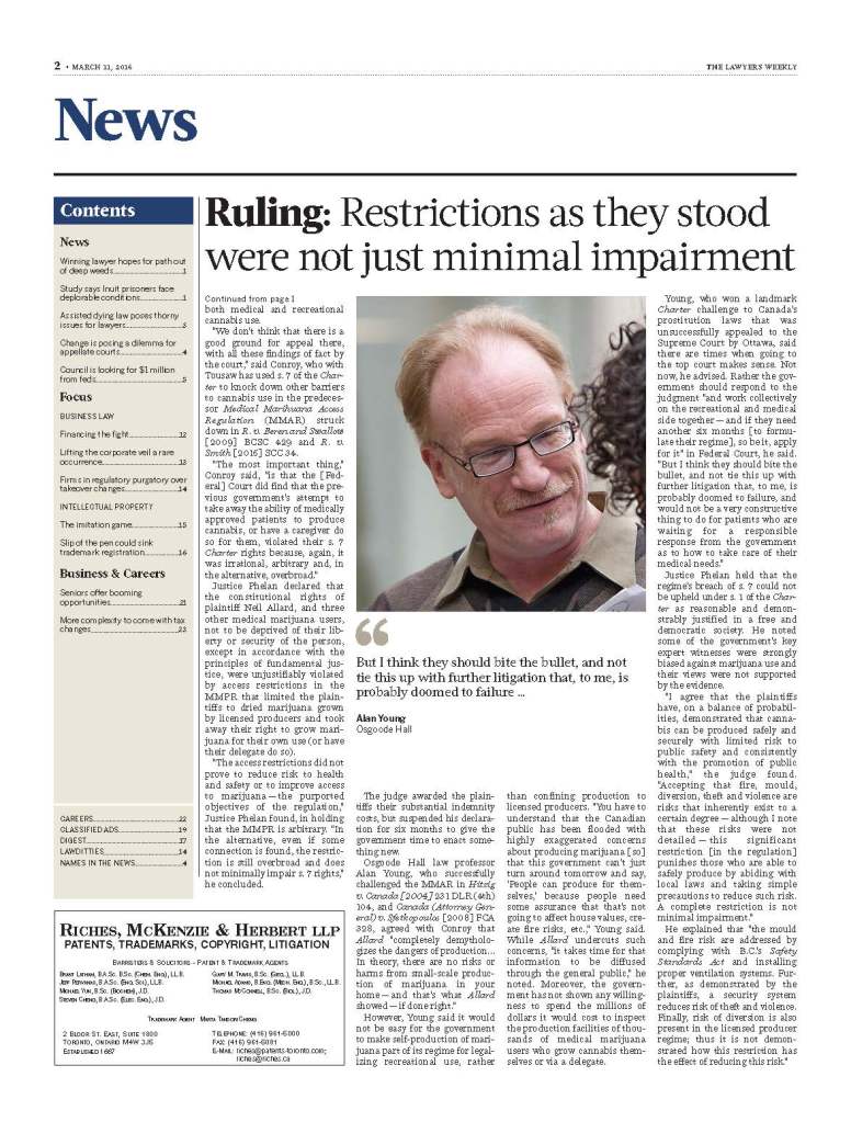 The eventual outcome from Allard (2015) determined that the right to “grow your own” was a protected right for medical authorized users of cannabis, and the MMPR framework unjustifiably infringed on that right; It forced them to purchase only from government suppliers, and arguments presented by Mr. Conroy and Kirk Tousaw discussed here, resulted in new regulations (the ACMPR, 2016) permitting authorized medical users to grow their own cannabis in addition to purchasing from licensed producers.