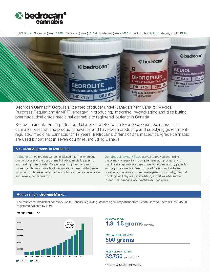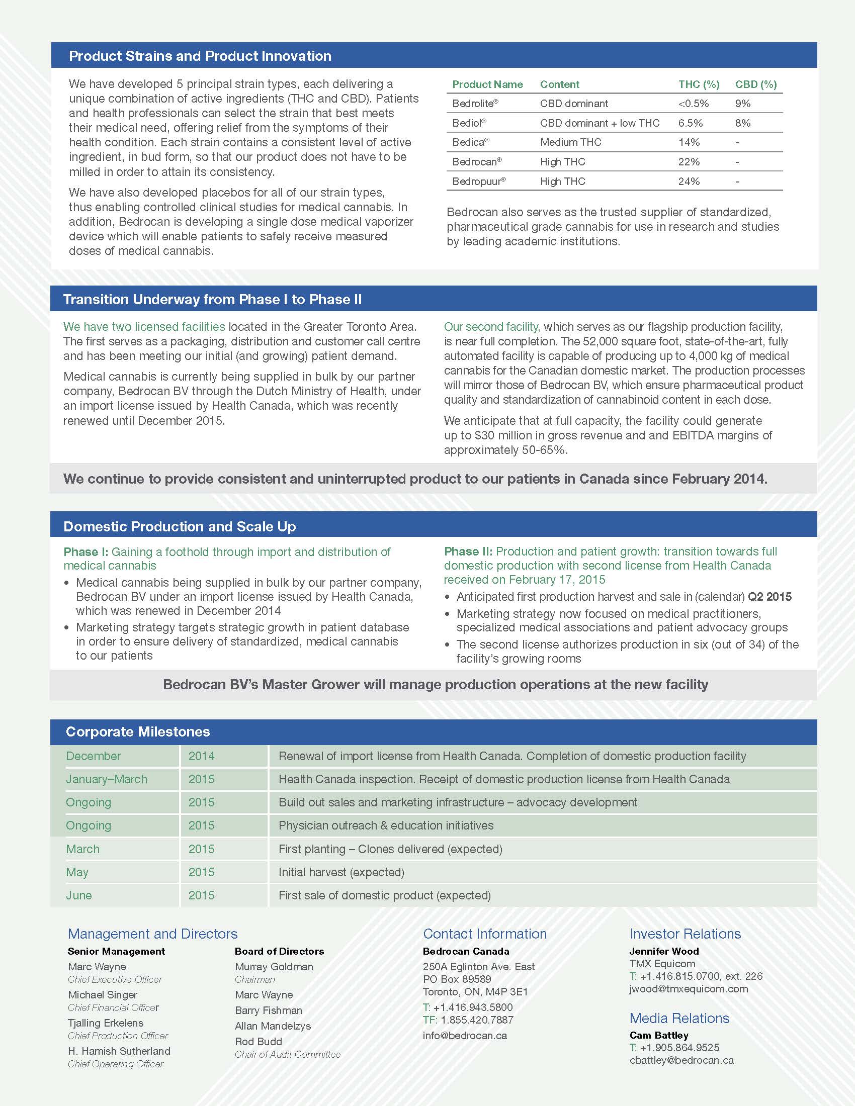 A March 2015 flyer for Bedrocan, an early licensed producer of medical cannabis in Canada. Having started with importing medical cannabis through the Dutch Ministry of Health under a complex import license issued by Health Canada, this document highlights the optimistic early beginnings of domestic cannabis production in Canada. Submission by Mary DuRocher CEO of Fox D Consulting